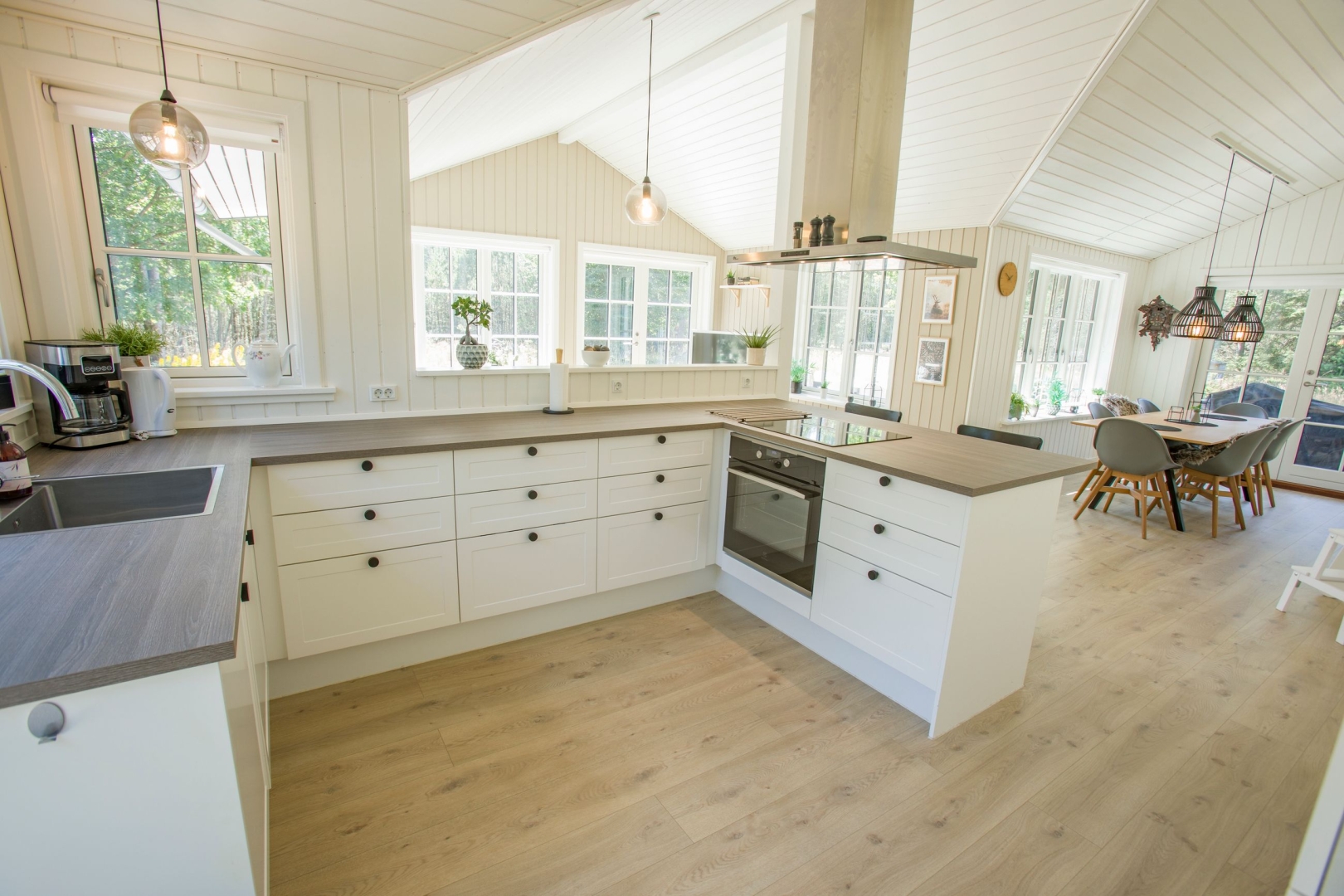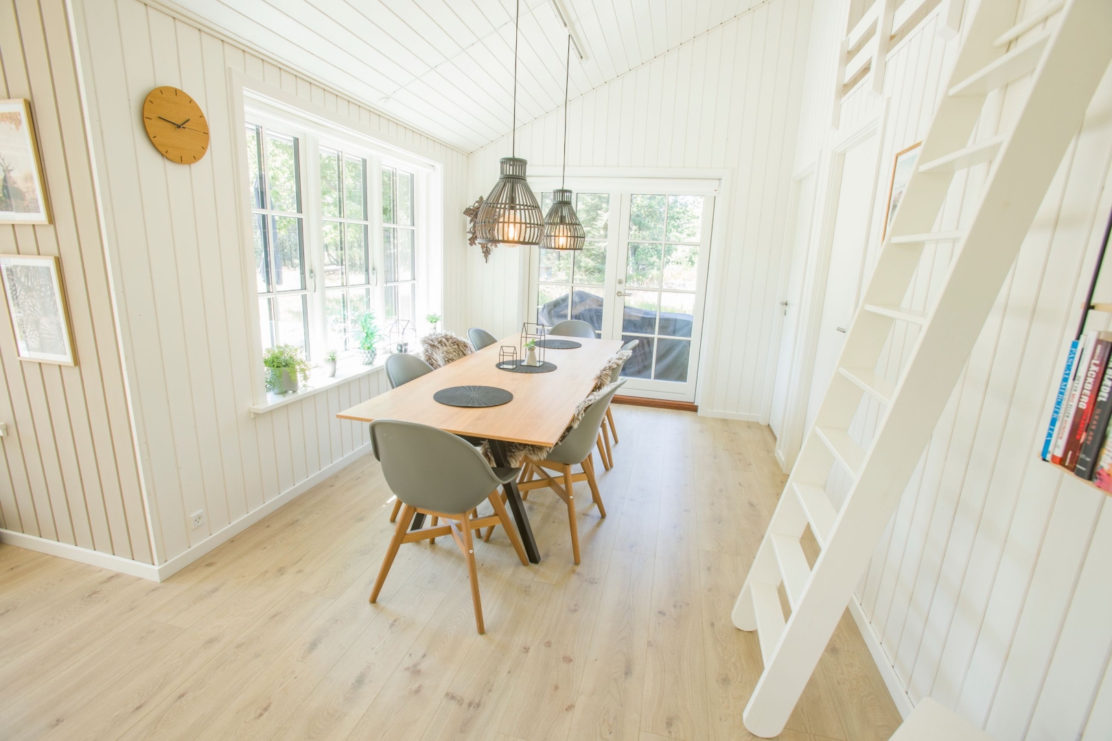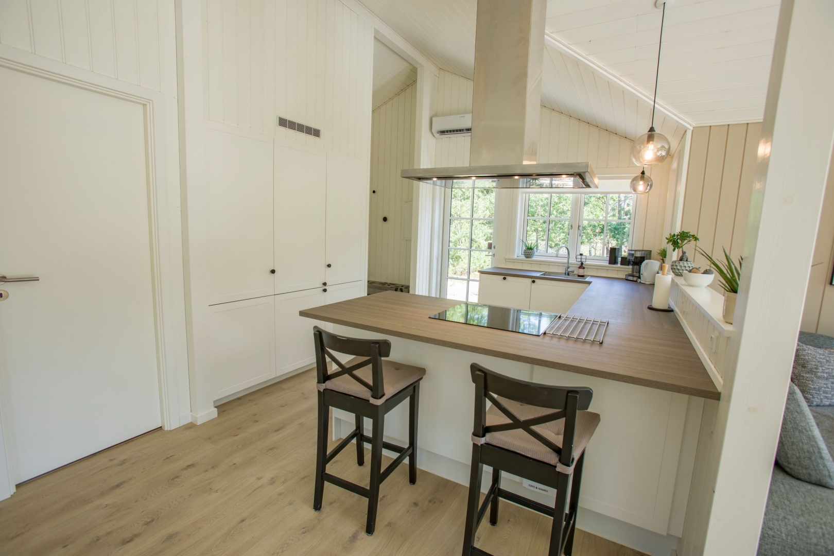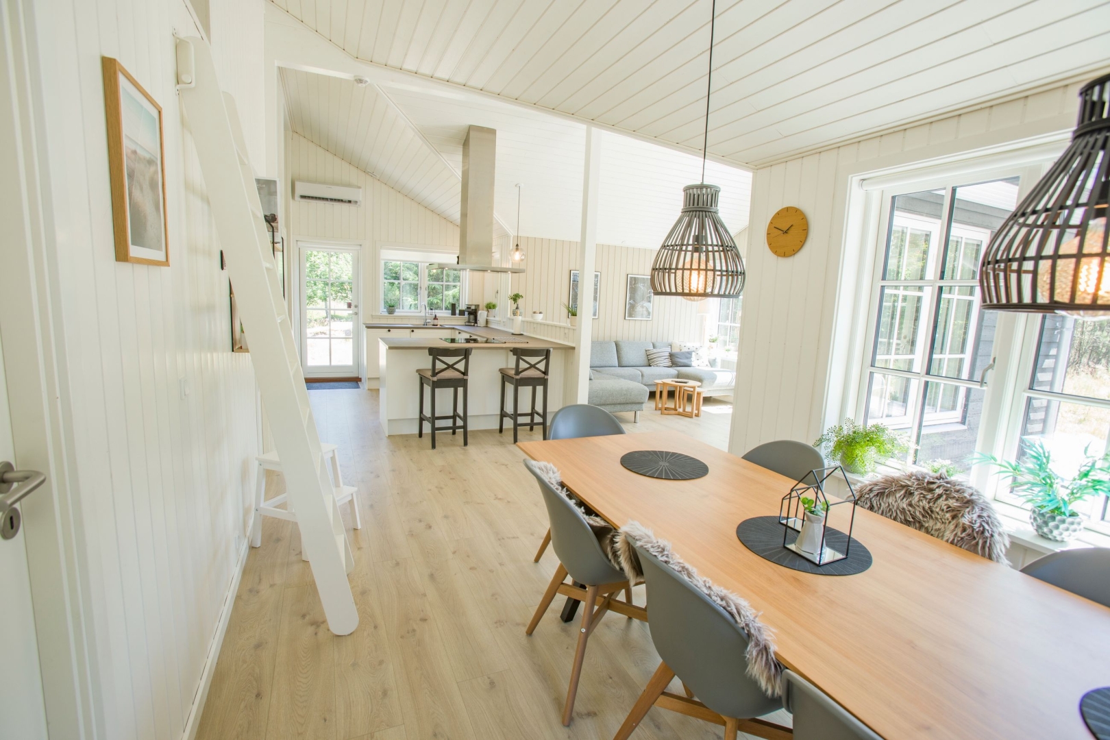 Materialevalget i huset er gennemgående lyst og slidstærkt med hvide trælofter, lodrette træpaneler på væggene og praktiske gulve alt sammen med til at understrege den moderne sommerhusstemning. Der er installeret Nord Energi fibernet, hvilket giver gode muligheder for at kombinere ferie med arbejde eller streaming på regnvejrsdage.