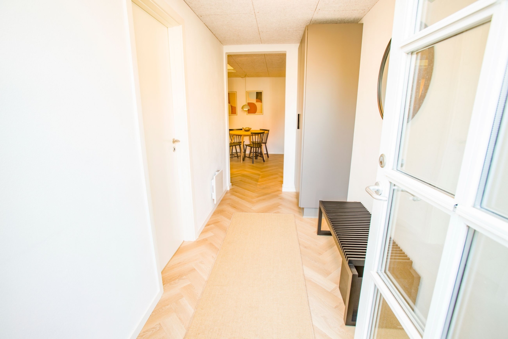 Lejligheden har gennemgået en gennemgribende forvandling, hvor lofter, gulve, vægge, køkken og bad er blevet fornyet. Her er Troltex-lofter, sildebensparket, nye fermacell-plader på vægge for perfekt finish og et gennemført moderne look, der matcher den historiske charme omkring ejendommen.
