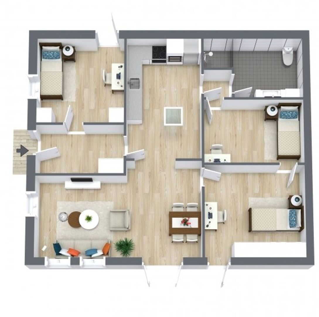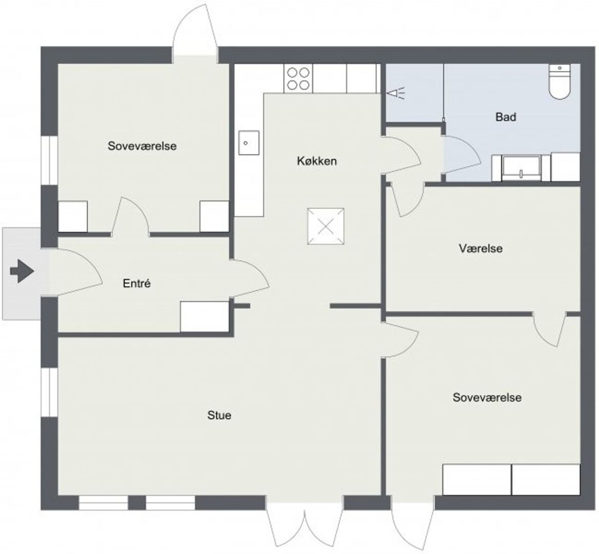 Lejligheden byder på tre store værelser, hvoraf to har direkte udgang. Det nye, stilrene køkken har masser af skabsplads, en hyggelig spiseplads under ovenlysvinduet, og ligger i åben forbindelse med den indbydende kombineret spise og opholdstue. Her er der installeret varmepumpe, flotte lydpaneler på væggen, og udgang til en dejlig vestvendt terrasse perfekt til eftermiddags- og aftensolen.