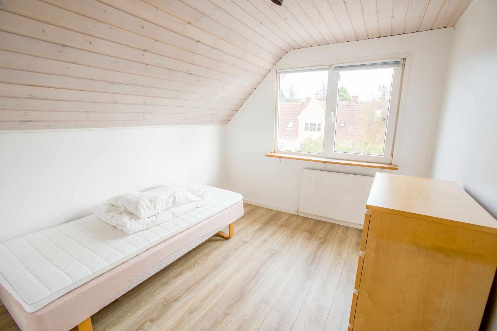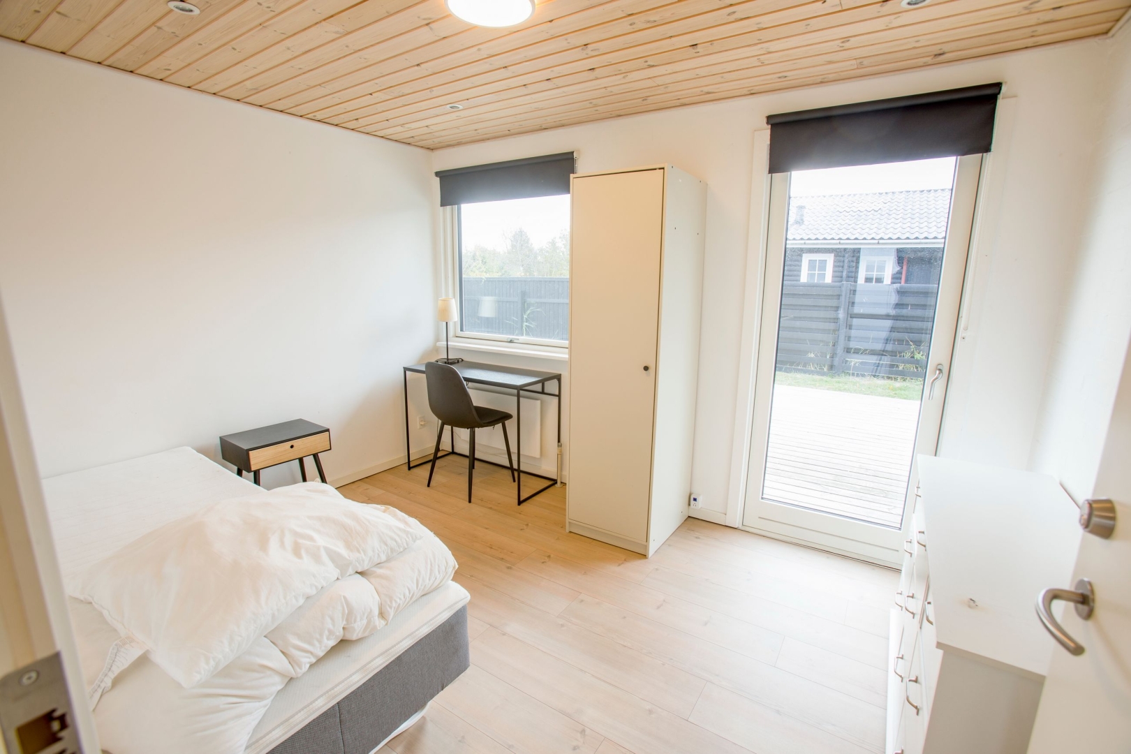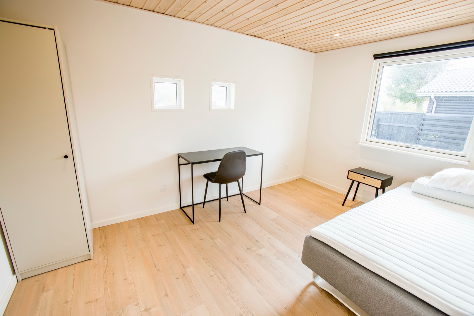 Hovedhuset byder på hele 161 m², hvor man straks fornemmer den lyse og venlige atmosfære. Her findes en indbydende entré, moderne badeværelse med bruseniche, værelse og et soveværelse med direkte adgang til terrasse. Det flotte køkken danner boligens naturlige samlingspunkt med udgang til en sydvestvendt udestue i glas, hvor man kan nyde det smukke lys samt udgang til gårdhaven. Et praktisk bryggers med vaskefaciliteter, yderligere et soveværelse med skabe. På førstesalen finder man et lyst køkkenalrum og stue i ét, to fine værelser, badeværelse samt et praktisk depotrum.