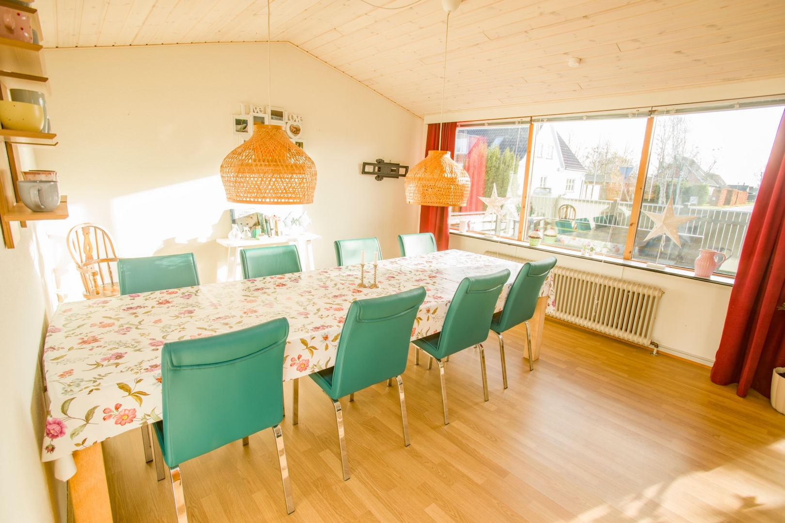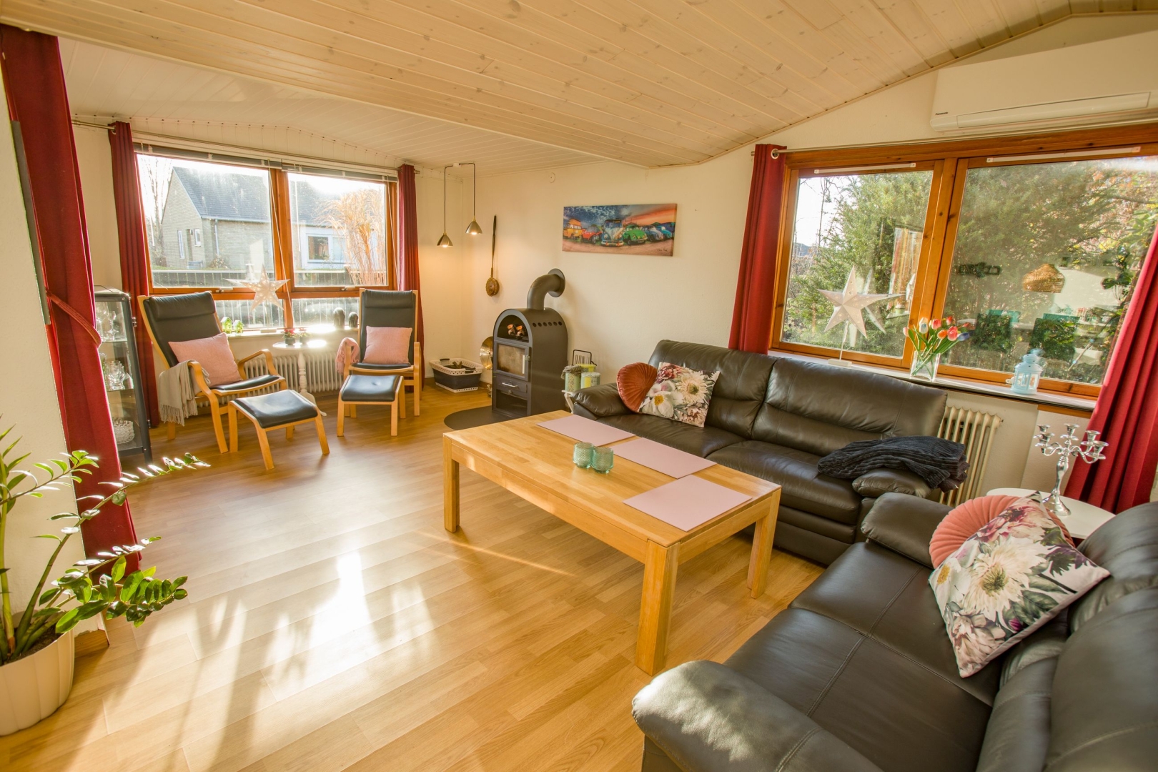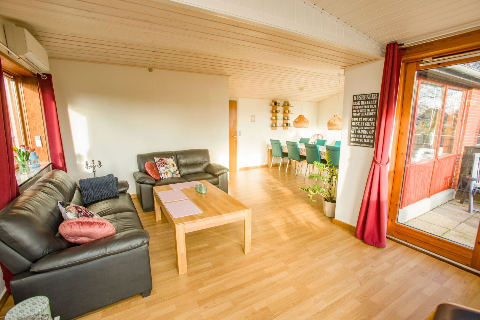 Boligen rummer 126 m² og byder på en praktisk og veldisponeret indretning. Fra baggangen med bord og vask er der adgang til et bryggers og fyrrum med nyt naturgasfyr, vaskemaskine og god skabsplads. Huset har tre rummelige værelser med faste skabe, et badeværelse med gulvvarme, klinker og et pænt arrangement med vask og toilet. Køkkenet er lyst og indbydende med spiseplads og et praktisk viktualierum, og i forlængelse heraf ligger den store, lyse stue med spiseafdeling, brændeovn, varmepumpe og udgang til den sydvendte terrasse.