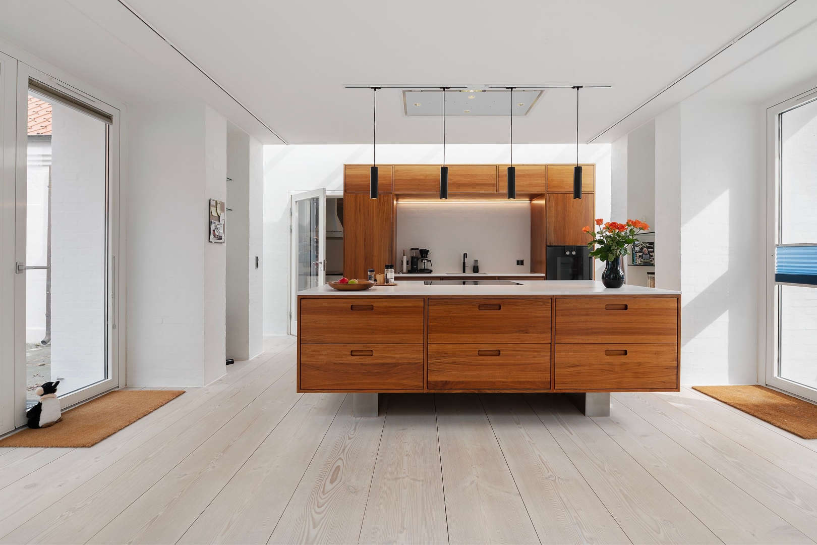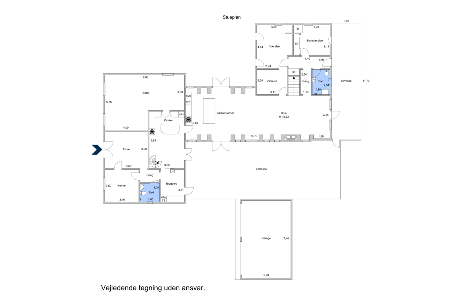Planløsningen er opdelt i to bygningsafsnit, der er smukt forbundet. I vest- og mellembygningen finder man et eksklusivt håndbygget Søgaard køkken i massiv valnød med luksus hvidevarer fra Gaggenau og en elegant svævende køkkenø. Køkkenalrum er åbent mod opholdsstuen, som er udstyret med pejseindsats og store vestvendte vinduespartier, der giver et skønt lysindfald og adgang til den lukkede, ugenerede gårdhave. Gulvvarme, massive Dinesen plankegulve med en imponerende længde på op til 15 meter samt en indbygget varmepumpe, der kan opvarme og køle hvilket giver rummet en særlig eksklusiv atmosfære. I stueplan findes desuden badeværelse med bruseniche, et soveværelse med skydedørsgarderobe samt 2 yderligere værelser, et med direkte adgang til opholdsstuen og et med udgang til den sydlige indkørsel. Værelset kan måske anvendes til atelier eller andet