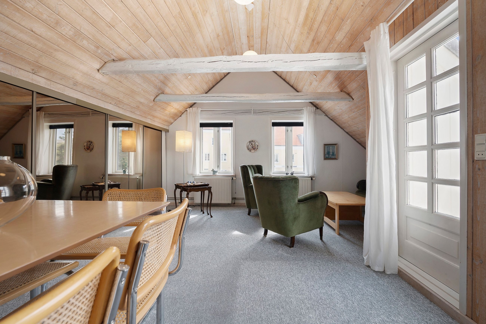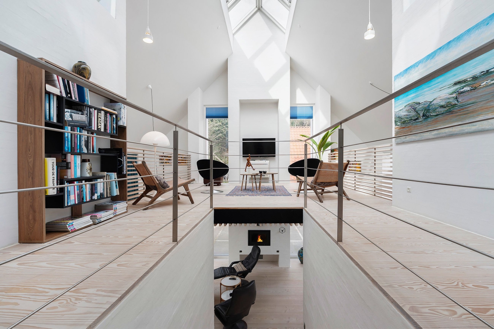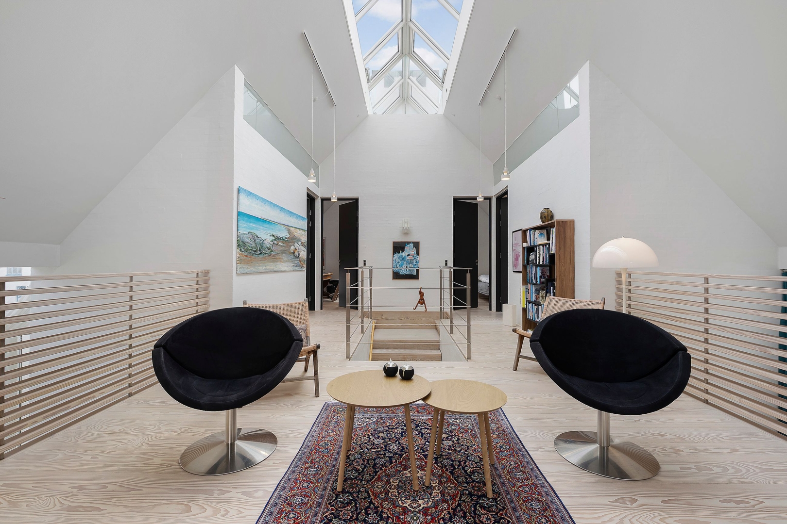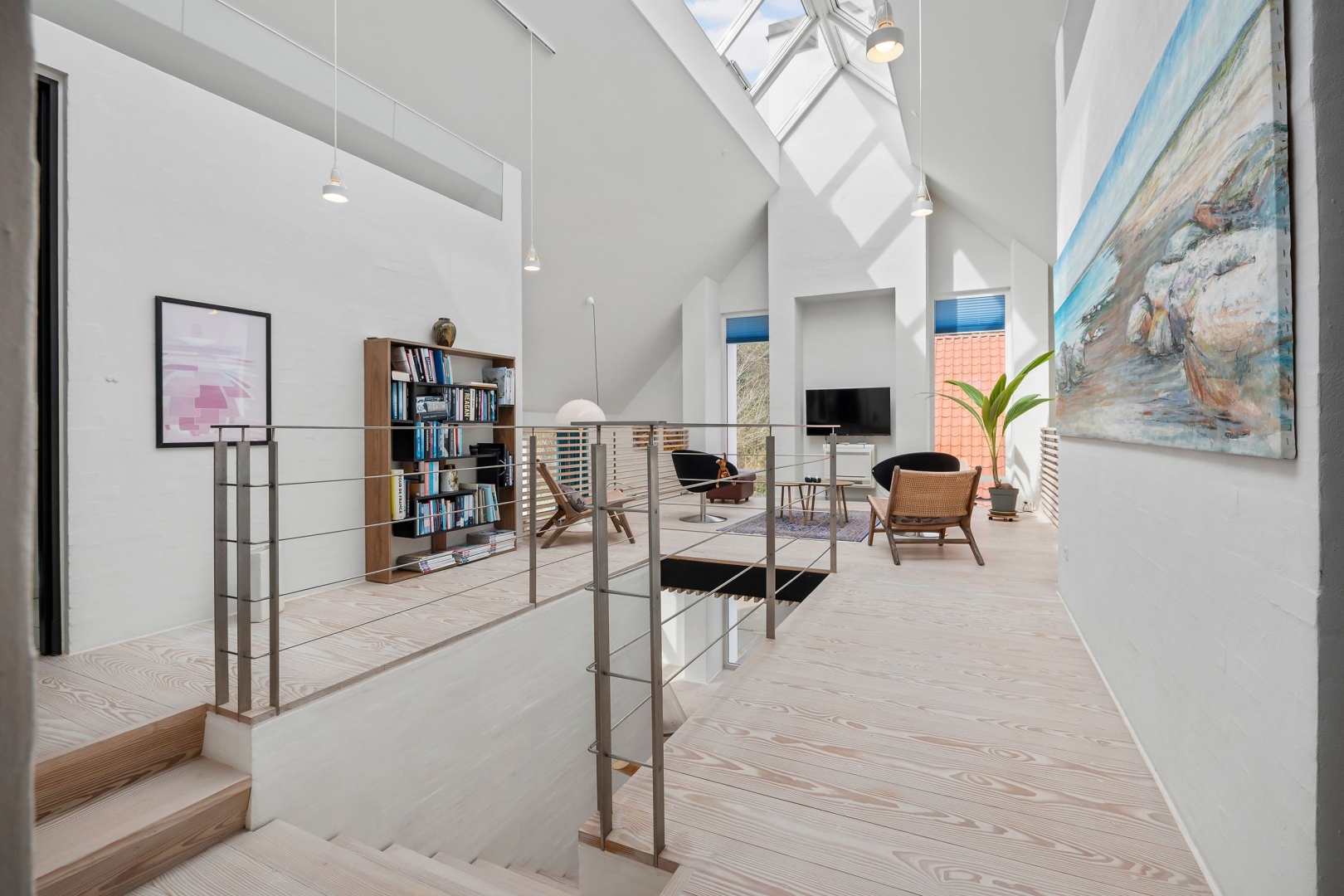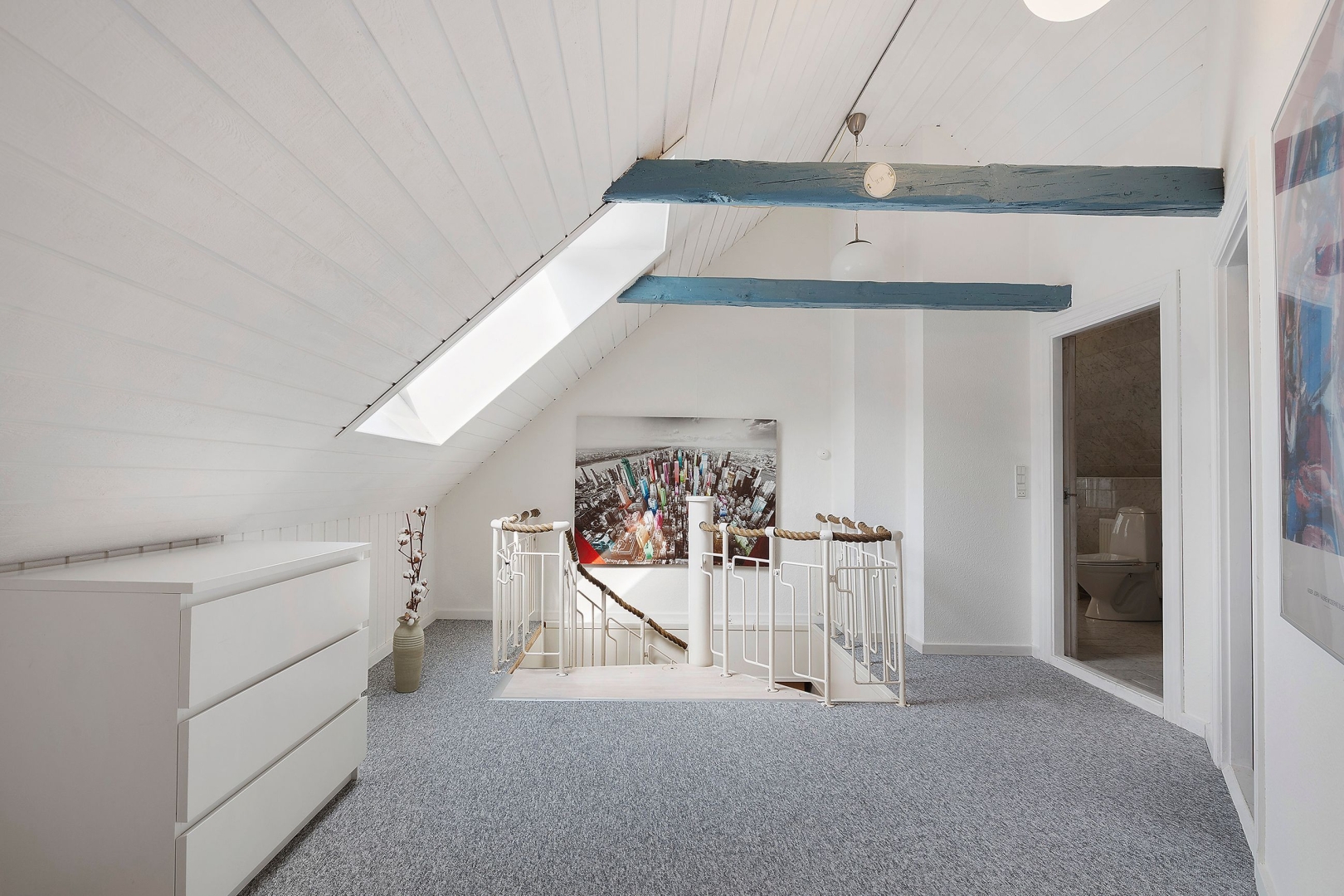 Fra stuen fører en trappe op til første sal, hvor en imponerende opholdsstue med loft til kip, rytterlys og varmepumpe udgør hjertet. Her er også to gavlværelser med adgang til hems hvor I finder en himmelseng med stjernekig, indbyggede skabe, loft til kip og udgang til altan, kontor/mindre værelse samt et badeværelse med bruseniche.