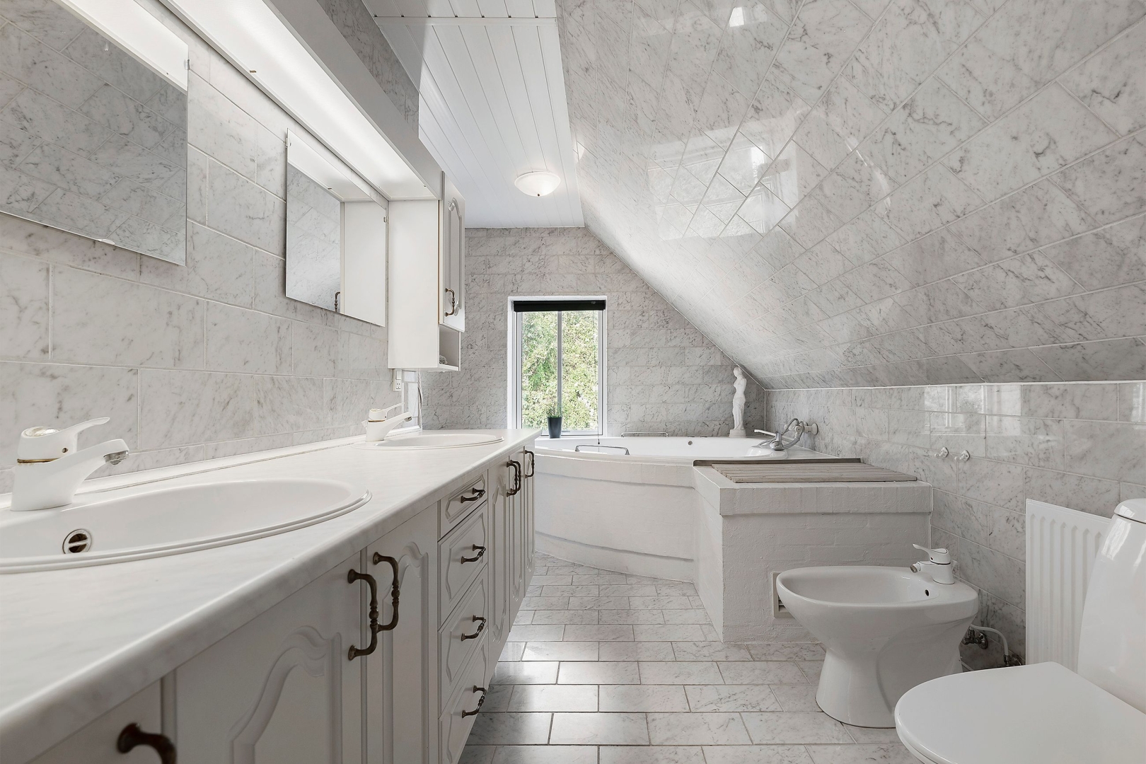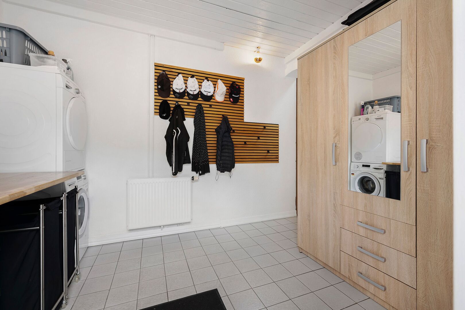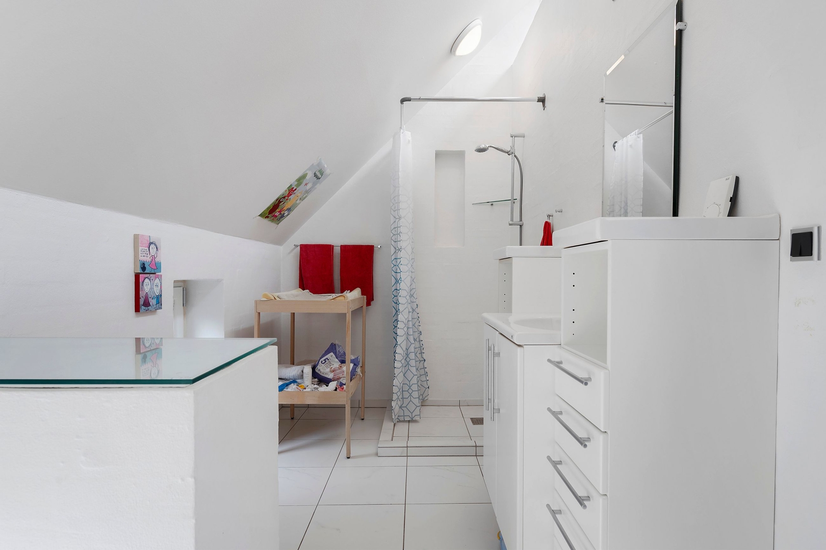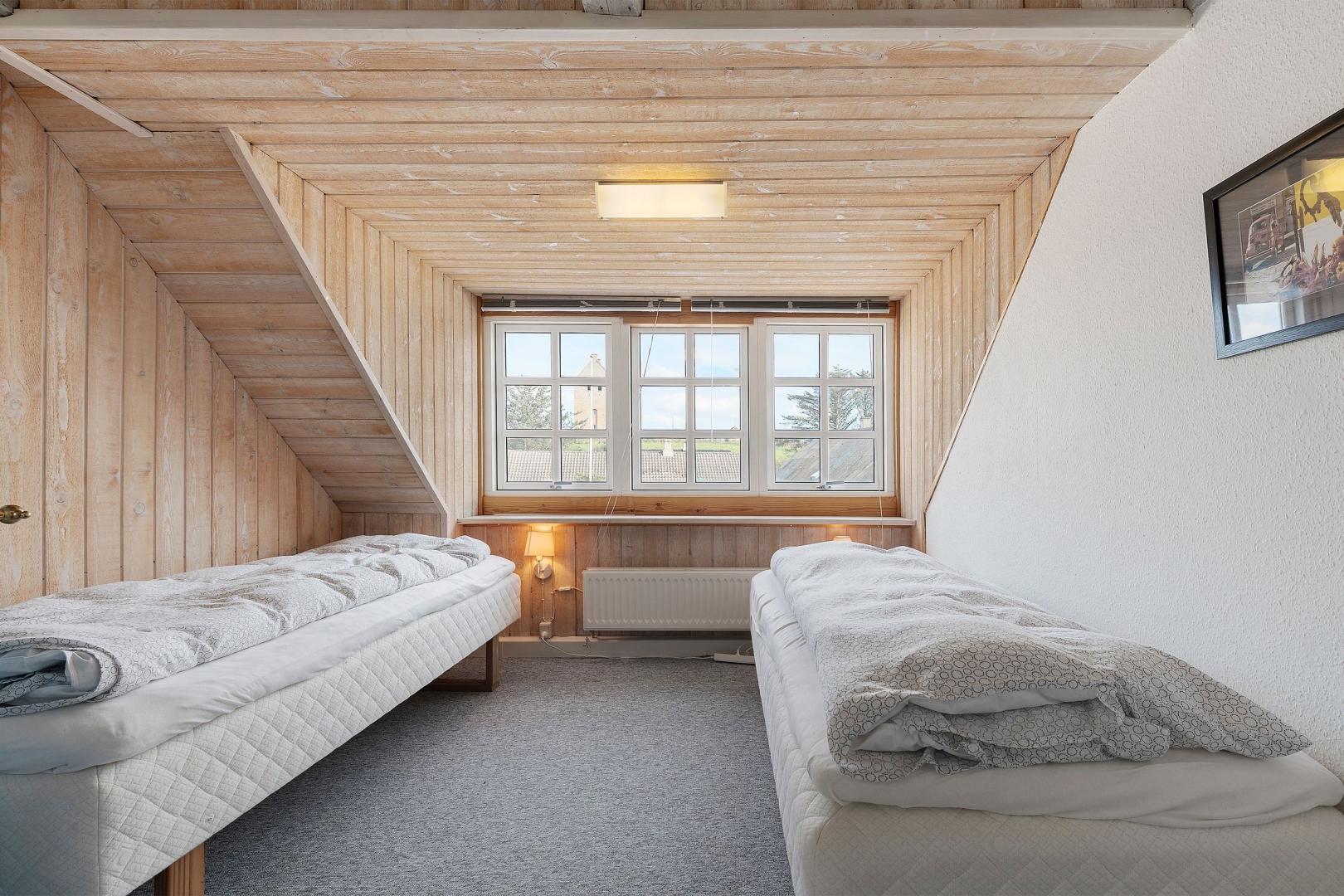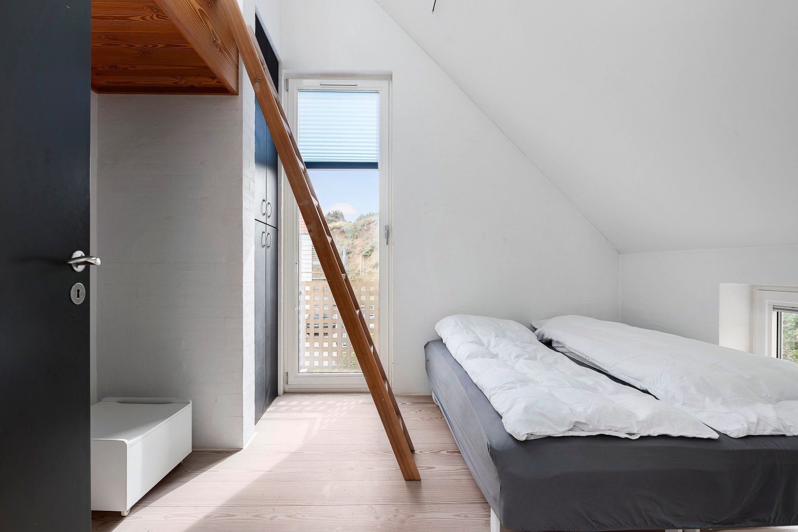 Fra stuen fører en trappe op til første sal, hvor en imponerende opholdsstue med loft til kip, rytterlys og varmepumpe udgør hjertet. Her er også to gavlværelser med adgang til hems hvor I finder en himmelseng med stjernekig, indbyggede skabe, loft til kip og udgang til altan, kontor/mindre værelse samt et badeværelse med bruseniche.