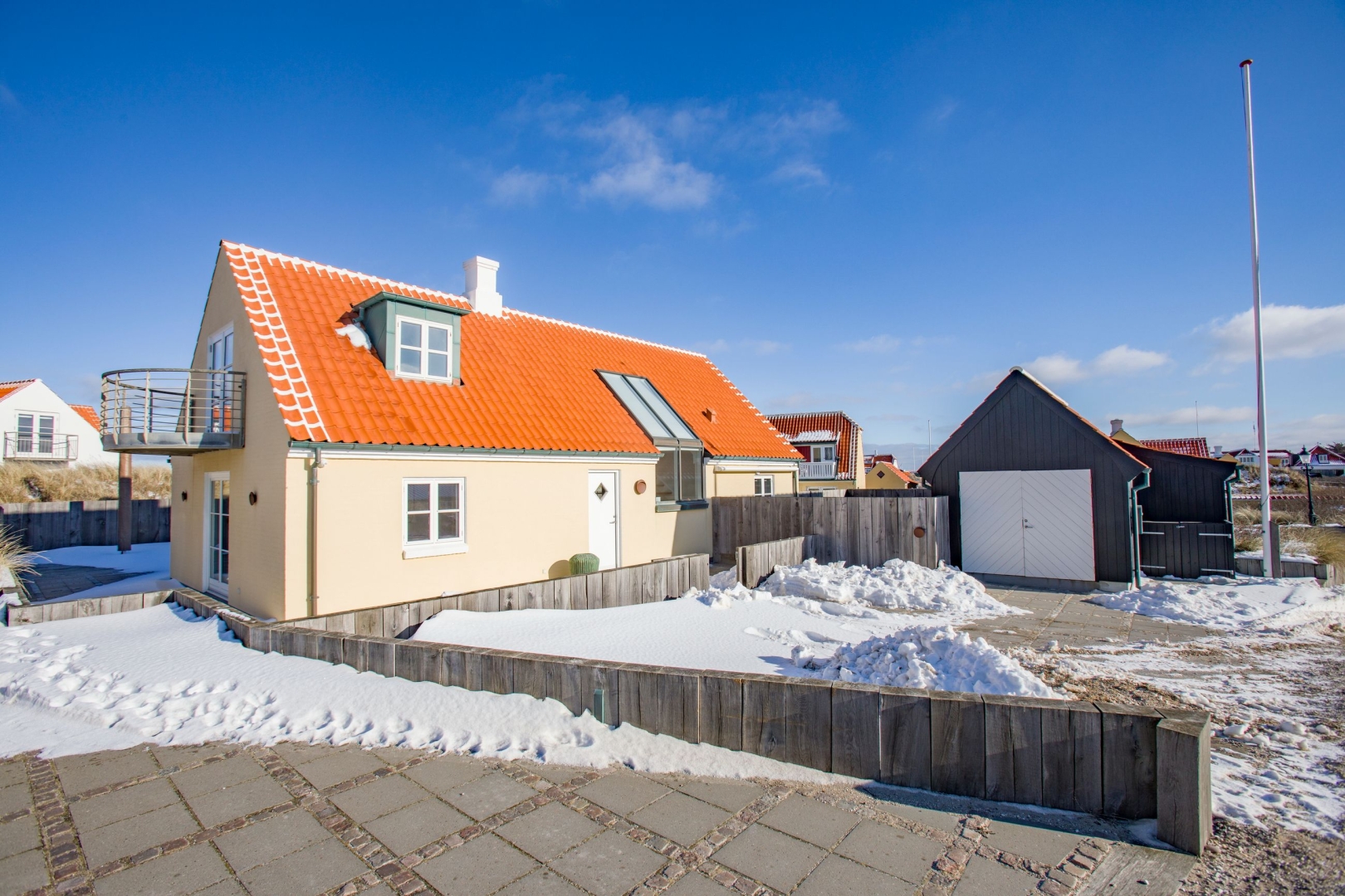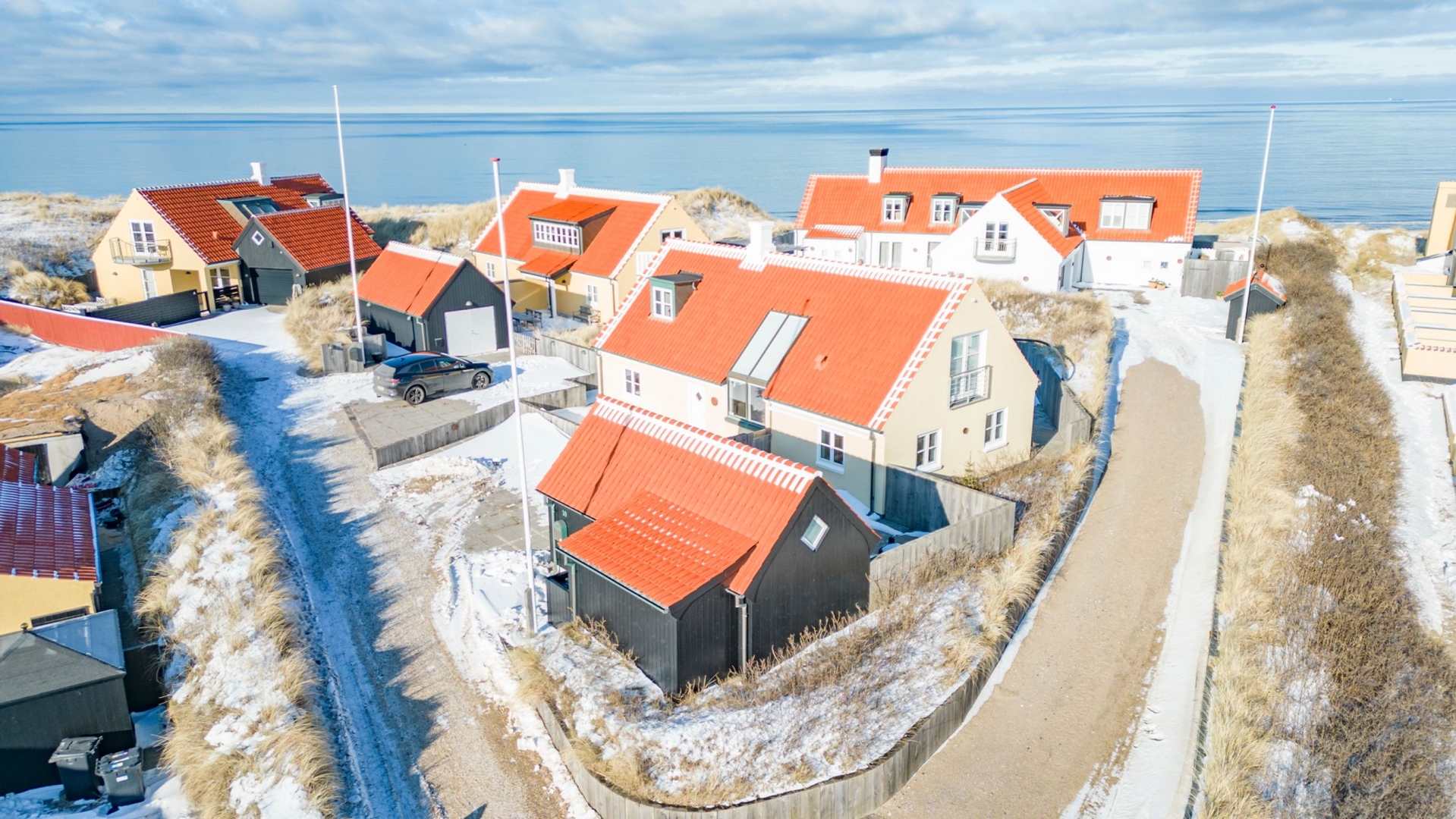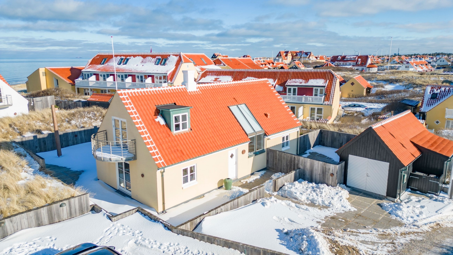 Velkommen til en af områdets mest gennemførte og stemningsfulde ejendomme, hvor arkitektur, komfort og beliggenhed smelter sammen på smukkeste vis. Her bor du med en udsigt, der tager pusten fra én direkte mod Skagerak, Sømærket, Ruths Hotel og ind over charmerende Gl. Skagen. Solnedgangene herfra er intet mindre end spektakulære.