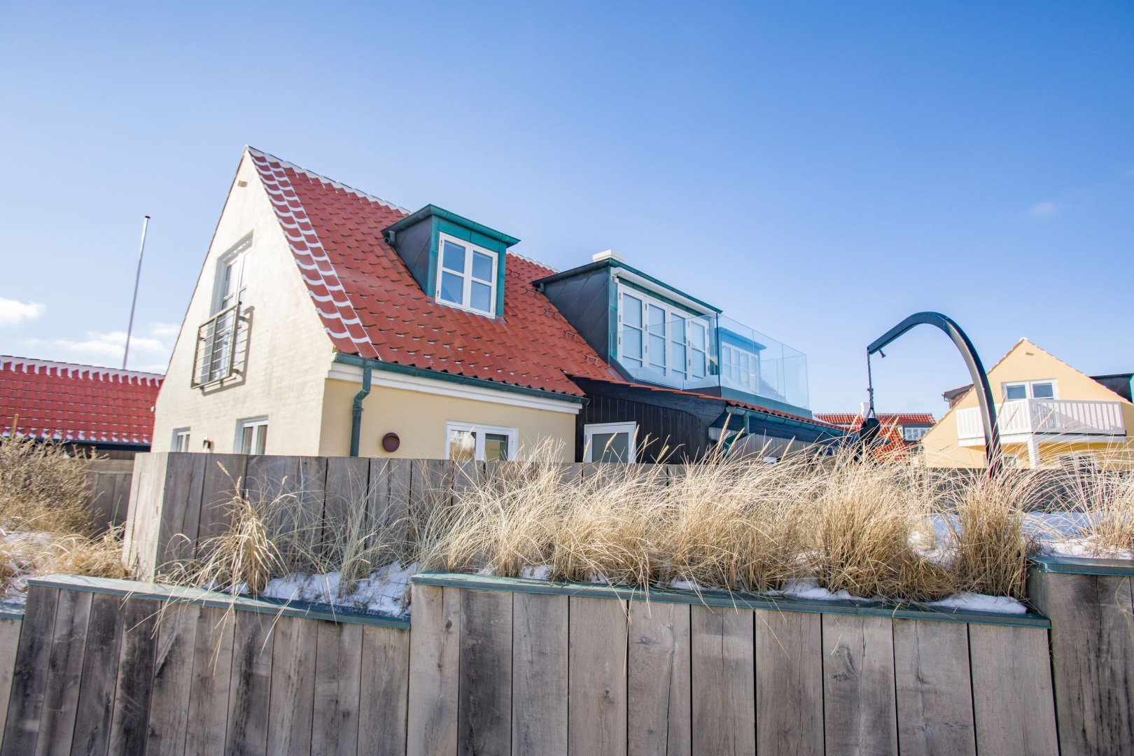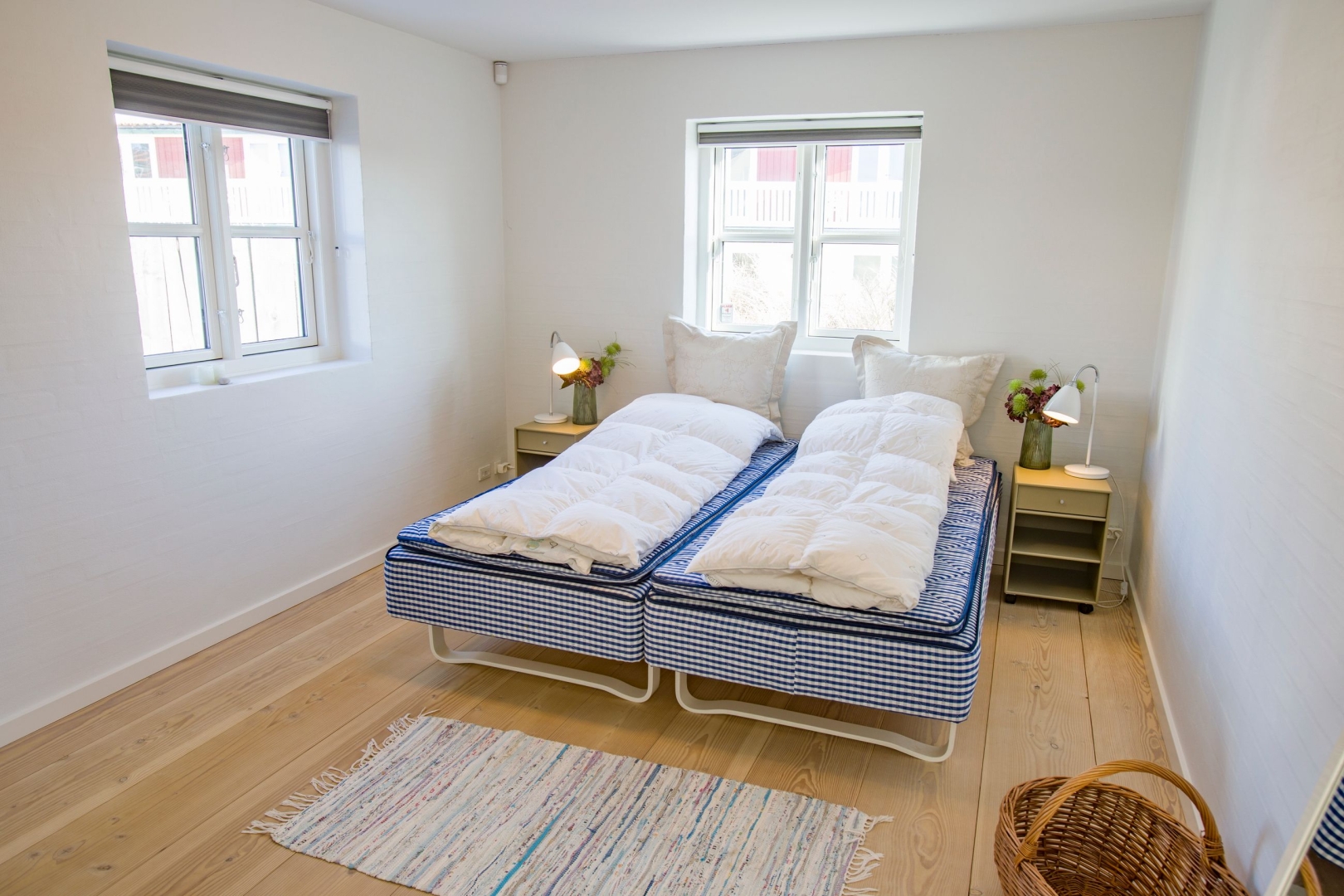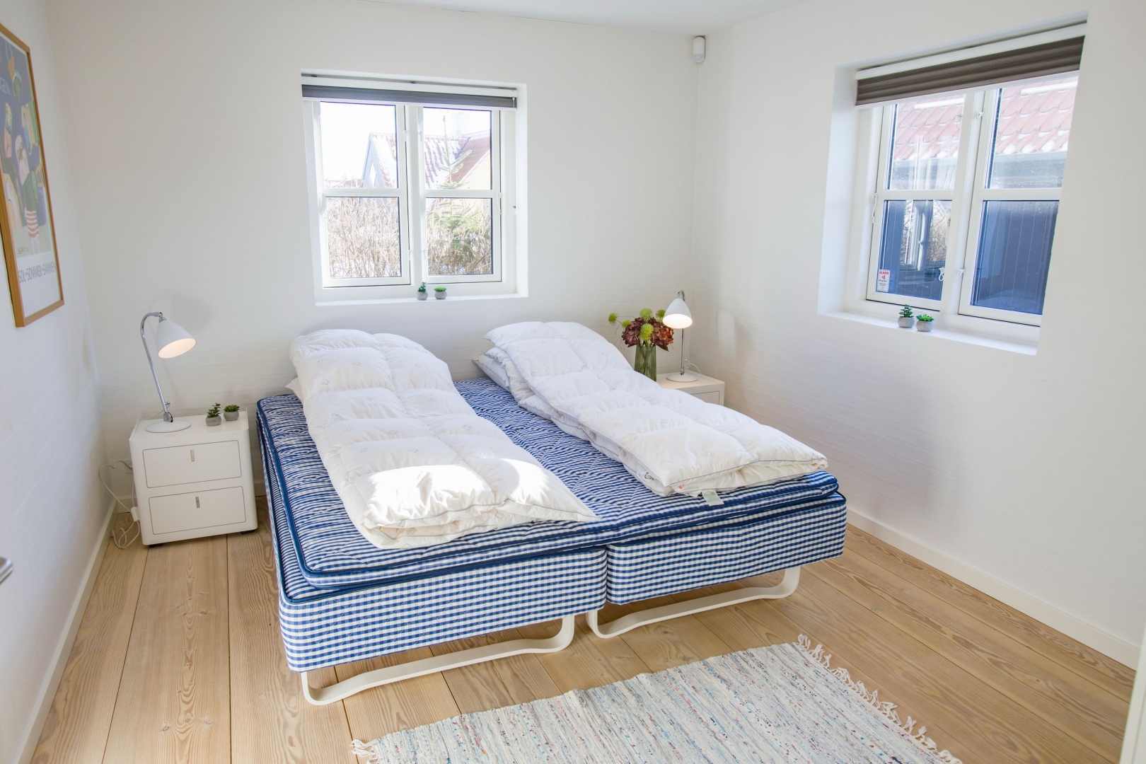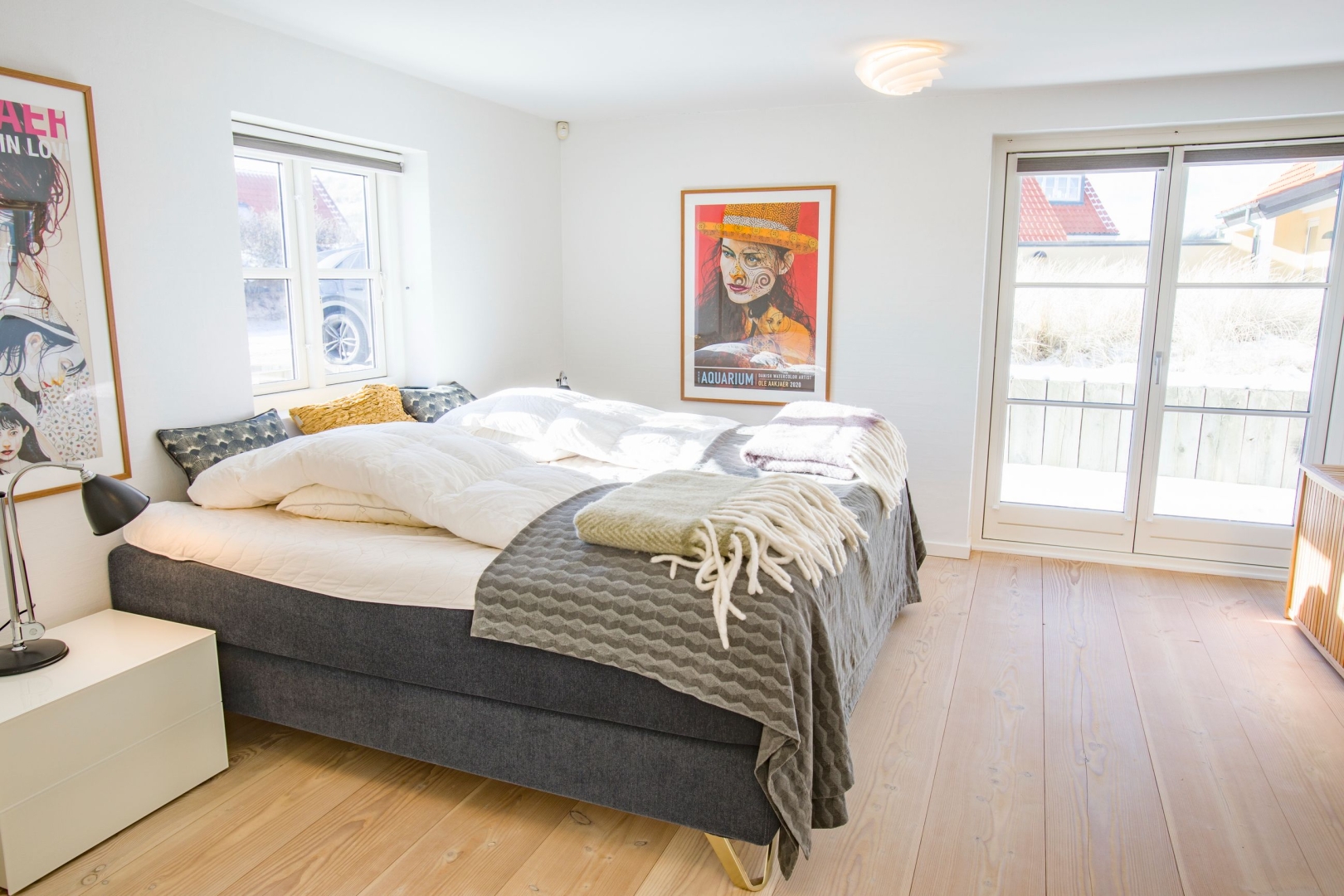 Indenfor bydes du velkommen i en lys og indbydende hall med flot kig til første sal. Masterafdelingen er rummelig og velindrettet med udgang, gode skabe og et stilfuldt badeværelse med stor bruseniche og væghængt toilet. Stueplanet rummer desuden to gode værelser med skabe, et gæstebadeværelse med praktisk udgang til gårdhaven ideelt efter en dukkert i Skagerak samt et stort, funktionelt bryggers med egen indgang, naturgasfyr, bord med vask, vaskesøjle, centralstøvsuger og rigelig skabsplads.