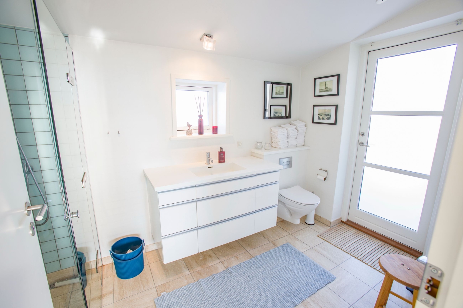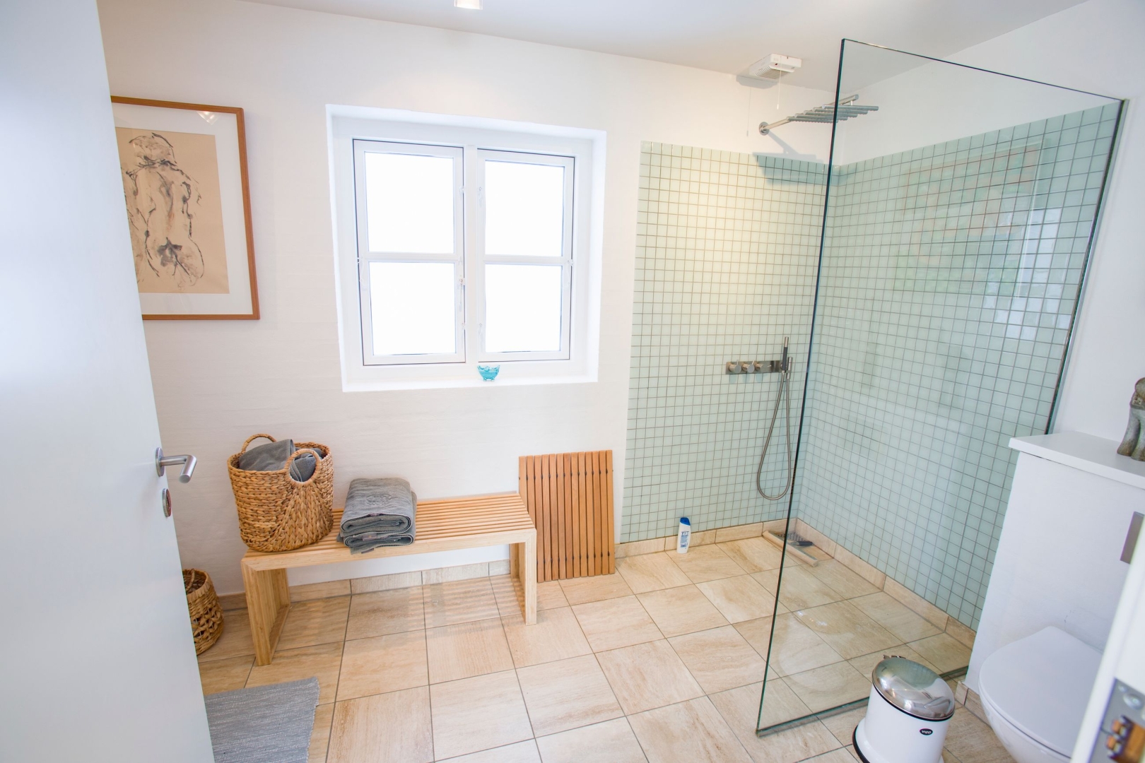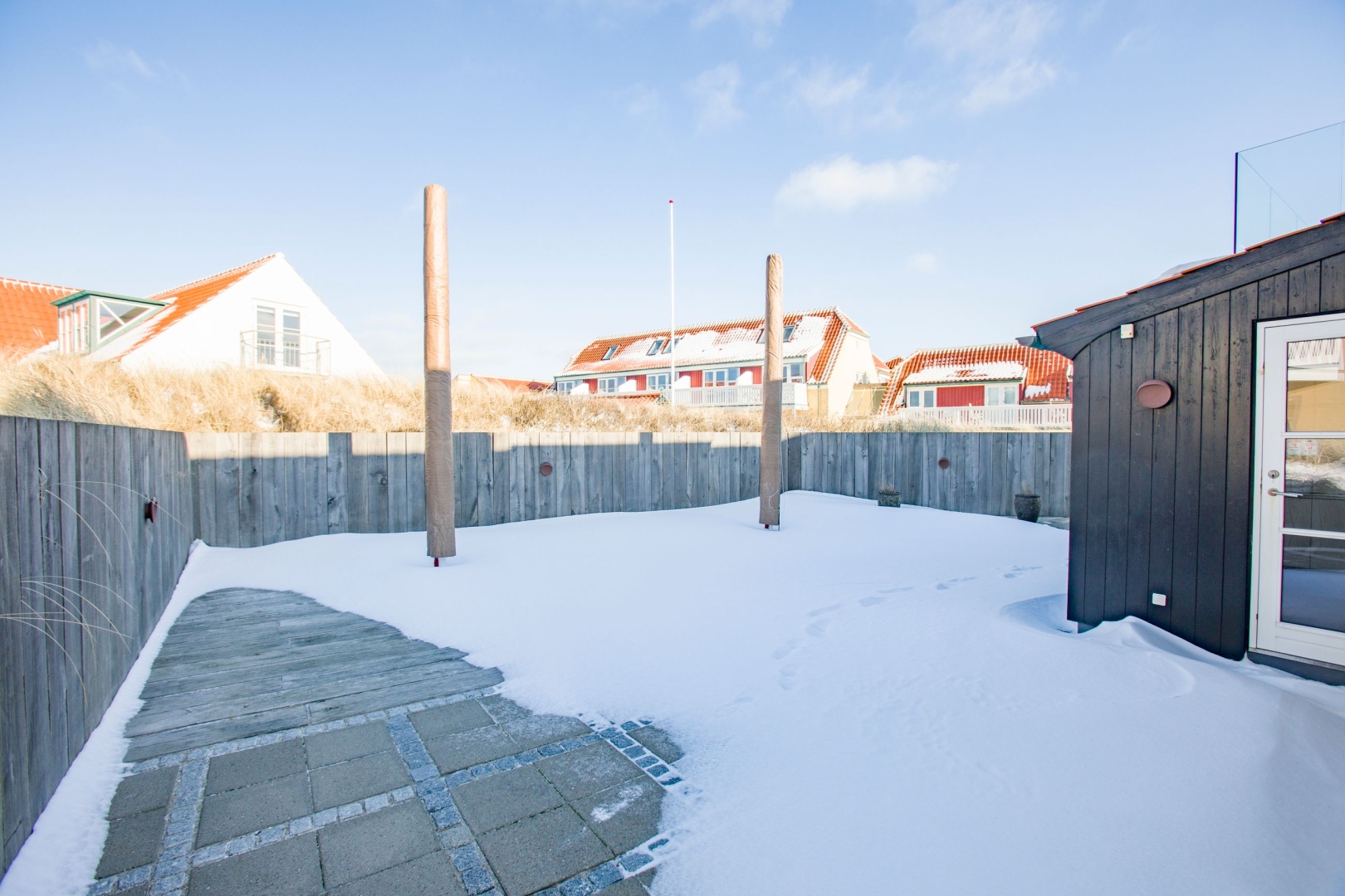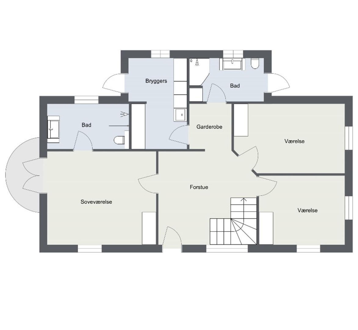 Indenfor bydes du velkommen i en lys og indbydende hall med flot kig til første sal. Masterafdelingen er rummelig og velindrettet med udgang, gode skabe og et stilfuldt badeværelse med stor bruseniche og væghængt toilet. Stueplanet rummer desuden to gode værelser med skabe, et gæstebadeværelse med praktisk udgang til gårdhaven ideelt efter en dukkert i Skagerak samt et stort, funktionelt bryggers med egen indgang, naturgasfyr, bord med vask, vaskesøjle, centralstøvsuger og rigelig skabsplads.