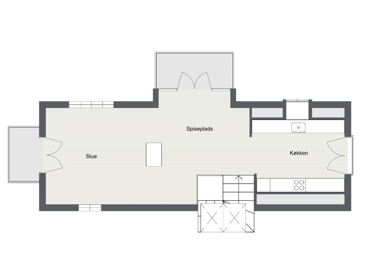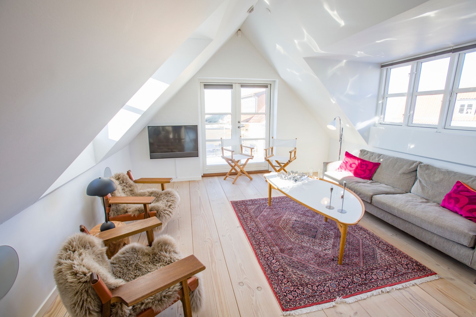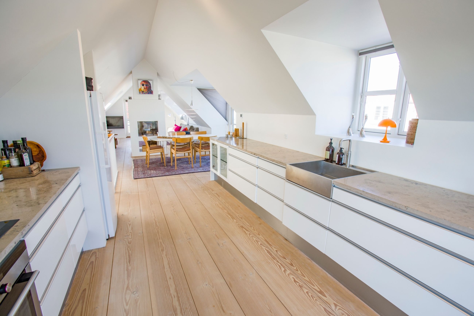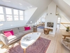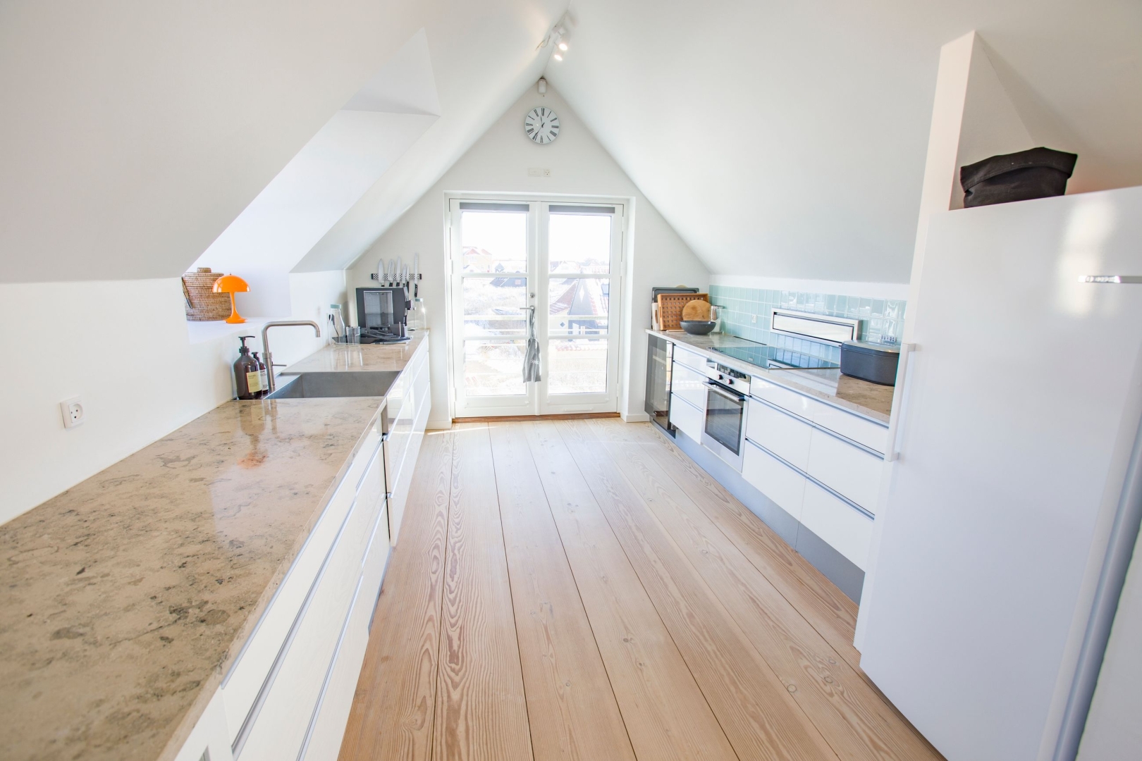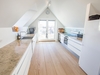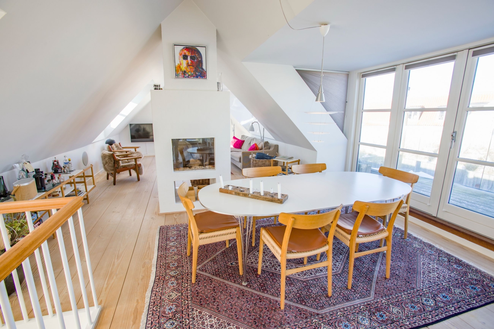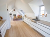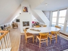 På første sal åbner boligen sig op med lys, luft og udsigt i hver eneste retning. Det lækre køkken ligger i forbindelse med en kvist, hvorfra man kan nyde havudsigten. Her er også en fransk altan med kig mod Ruths Hotel og Gl. Skagen, samt en skøn spiseplads med udsigt til Sømærket og udgang til en vestvendt altan, der indbyder til aftener i solnedgangen. En gennemgående pejs skaber en elegant overgang mellem spiseområdet og stuen. I stuen strømmer lyset ind fra den dobbelte kvist mod nord med havudsigt, fra kvisten mod syd og fra endnu en altan med udsigt over havet, hvilket tilsammen skaber et helt unikt rum med både varme og karakter.