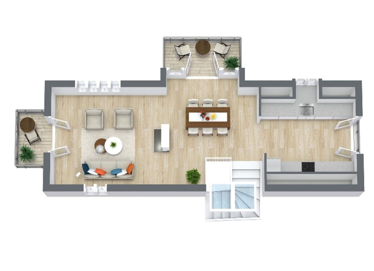 Udearealerne er i sig selv en oplevelse. En flot anlagt parkeringsplads giver god plads til flere biler, og både solgård og gårdhave er udformet med fokus på komfort og stemning. Den store gårdhave er indrettet med sveller, to store parasoller med strøm til terrassevarmere og moderne Cane-Line møbler, hvilket skaber et helt særligt uderum, hvor man næsten kan glemme tid og sted. De to altaner på første sal fuldender helheden og giver mulighed for at nyde udsigten og solnedgangen fra flere vinkler.