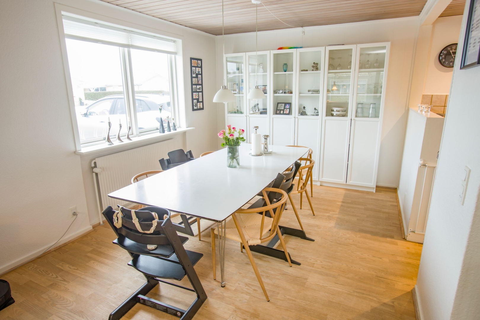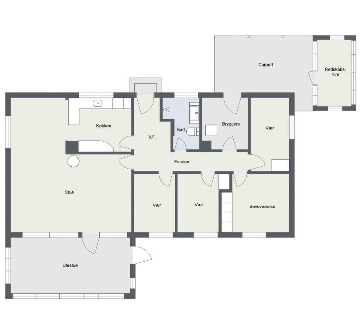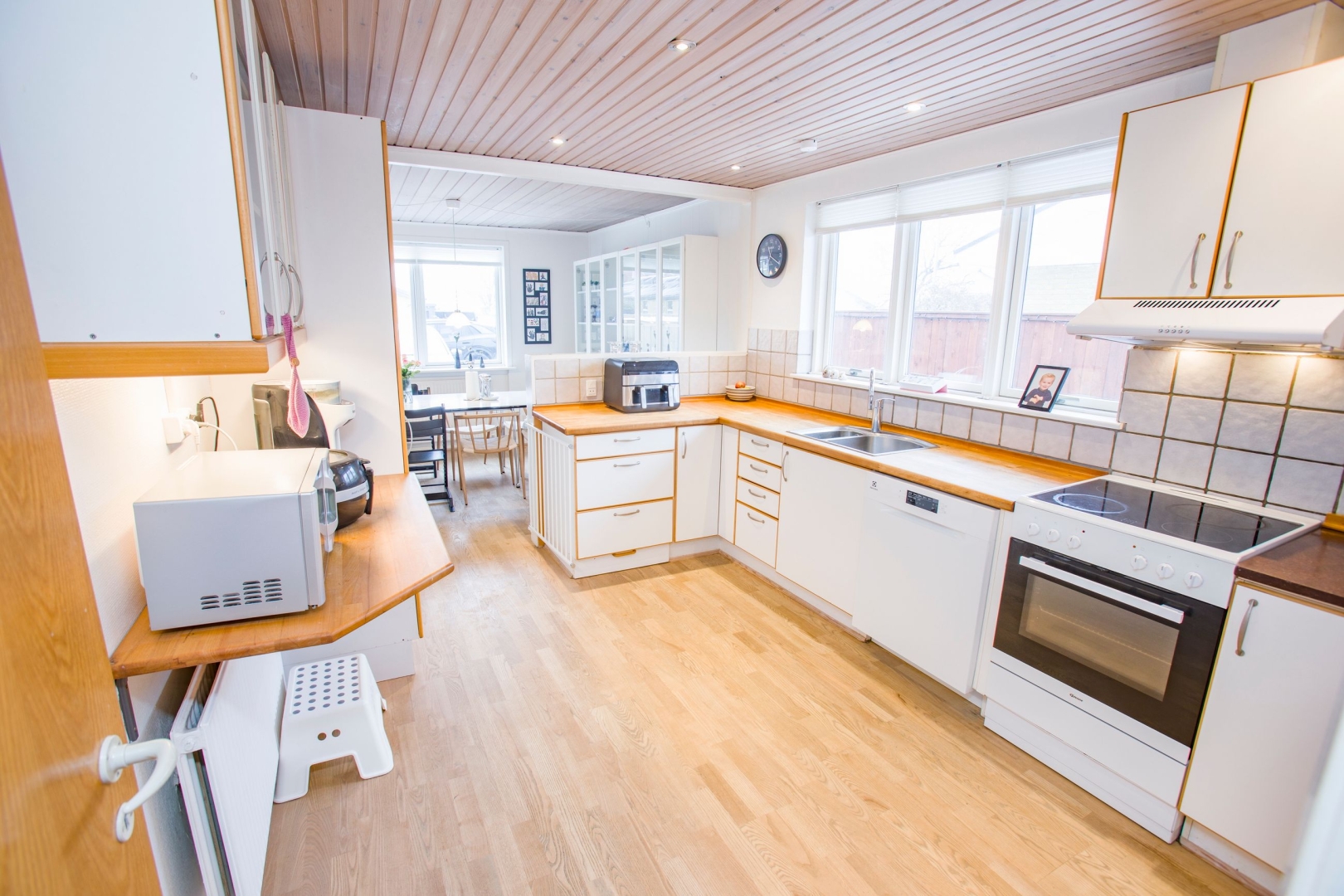 Indenfor byder boligen på et praktisk bryggers med mosaikgulv, skabe og vask samt tre regulære værelser. Soveværelset har skydedørsskabe. Badeværelset er flot renoveret i 2023 med klinkegulv, bruseniche, gulvvarme og spots i gipsloft, hvilket giver et moderne og indbydende udtryk. Fra gangen, der ligger åbent til entréen med nye klinker, ledes man videre ind i den store og lyse vinkelstue. Her skaber brændeovnen en hyggelig stemning, og den vinklede indretning giver en naturlig opdeling mellem spiseplads og opholdsområde. Fra stuen er der udgang til udestuen. Køkkenet er funktionelt og ligger åbent i forbindelse med spisepladsen.