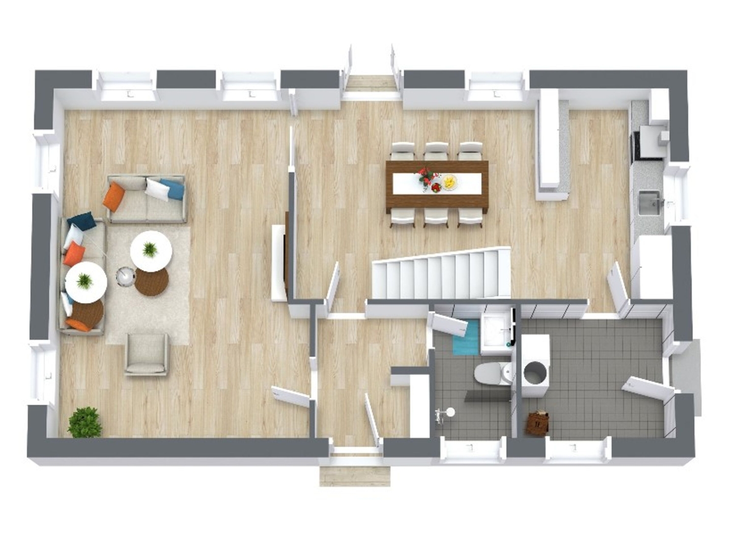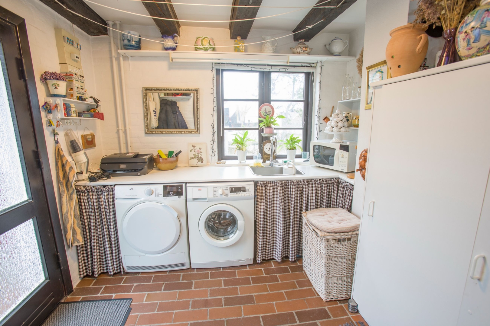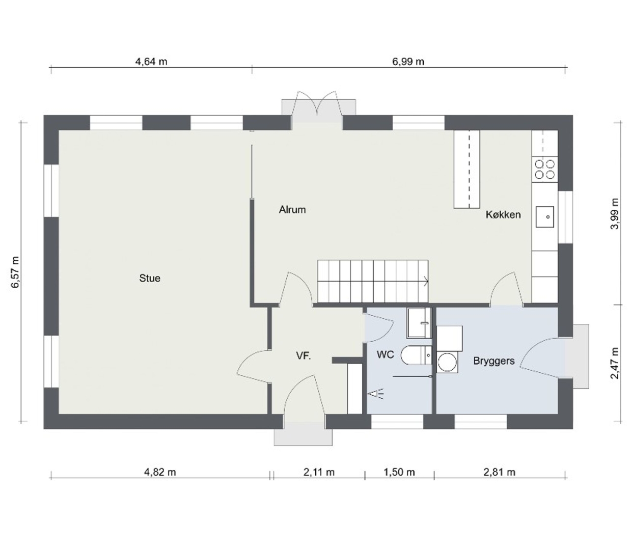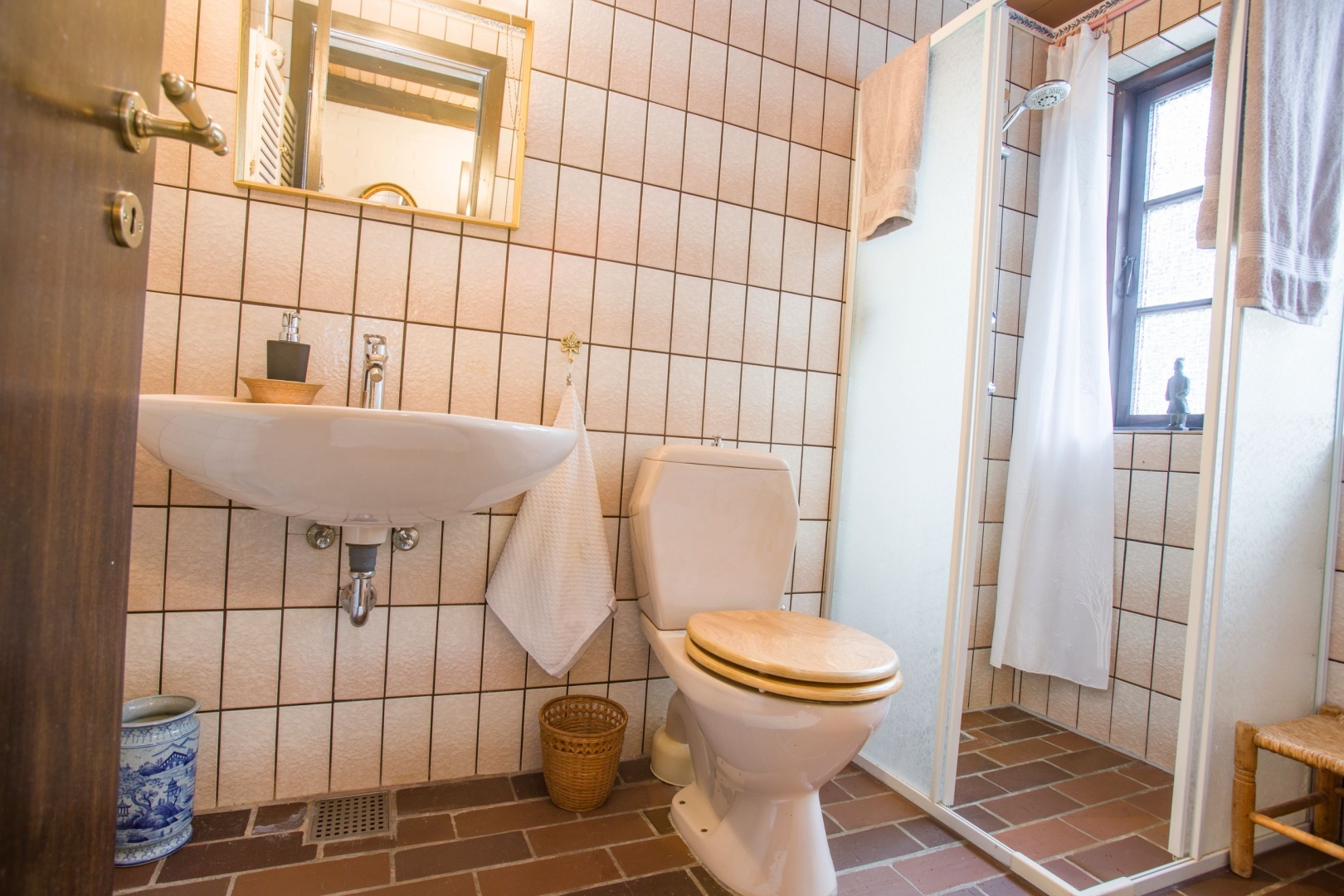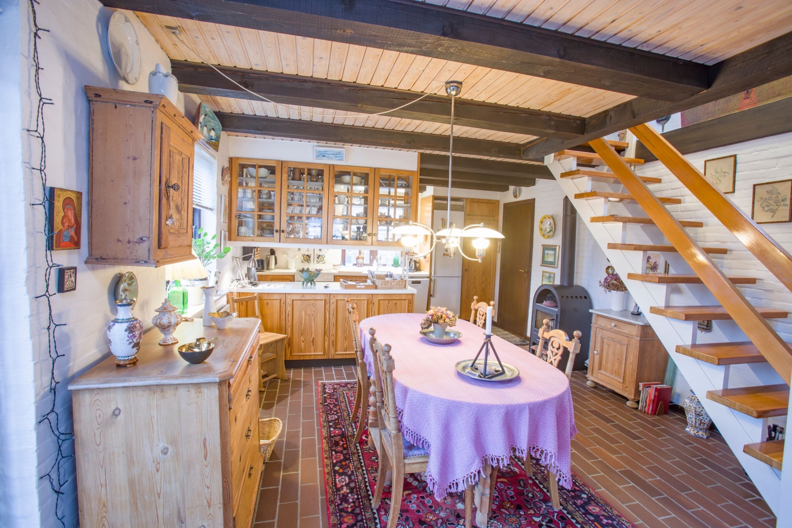 I stueplan bydes du velkommen i en entré med garderobe og murstensklinker. Herfra er adgang til gæstebadeværelse med bruseniche, gulvvarme, vask og toilet. Husets hjerte er det hyggelige køkken-alrum med klinkegulv i mursten, brændeovn, trappe til førstesalen samt udgang til terrasse og haven mod syd. Den tilstødende stue byder på en varm og autentisk atmosfære med synlige bjælker og ludet træloft. Derudover findes et praktisk bryggers med bord, vask og udgang til lukket sydvestvendt gårdhave.