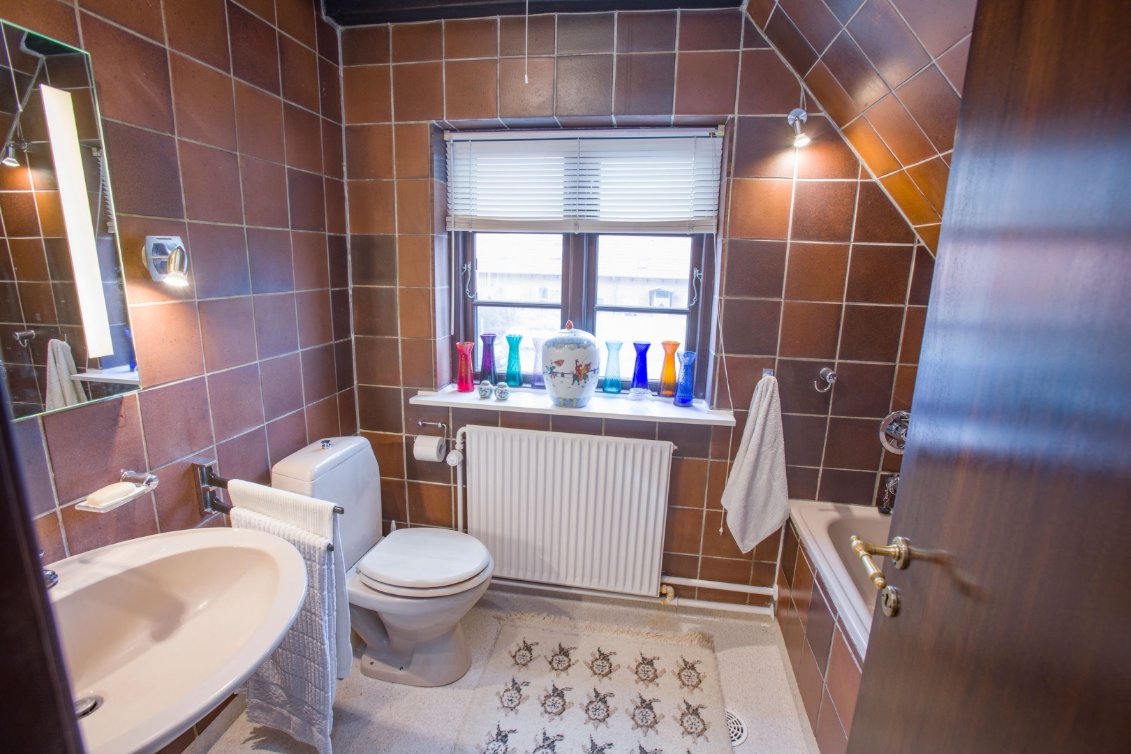 Udendørs får du både en sydvendt have med terrasse og drivhus samt en vestvendt, lukket gårdhave med indgang til udhus. Det trekantede udhus fungerer som værksted med garage i forlængelse.