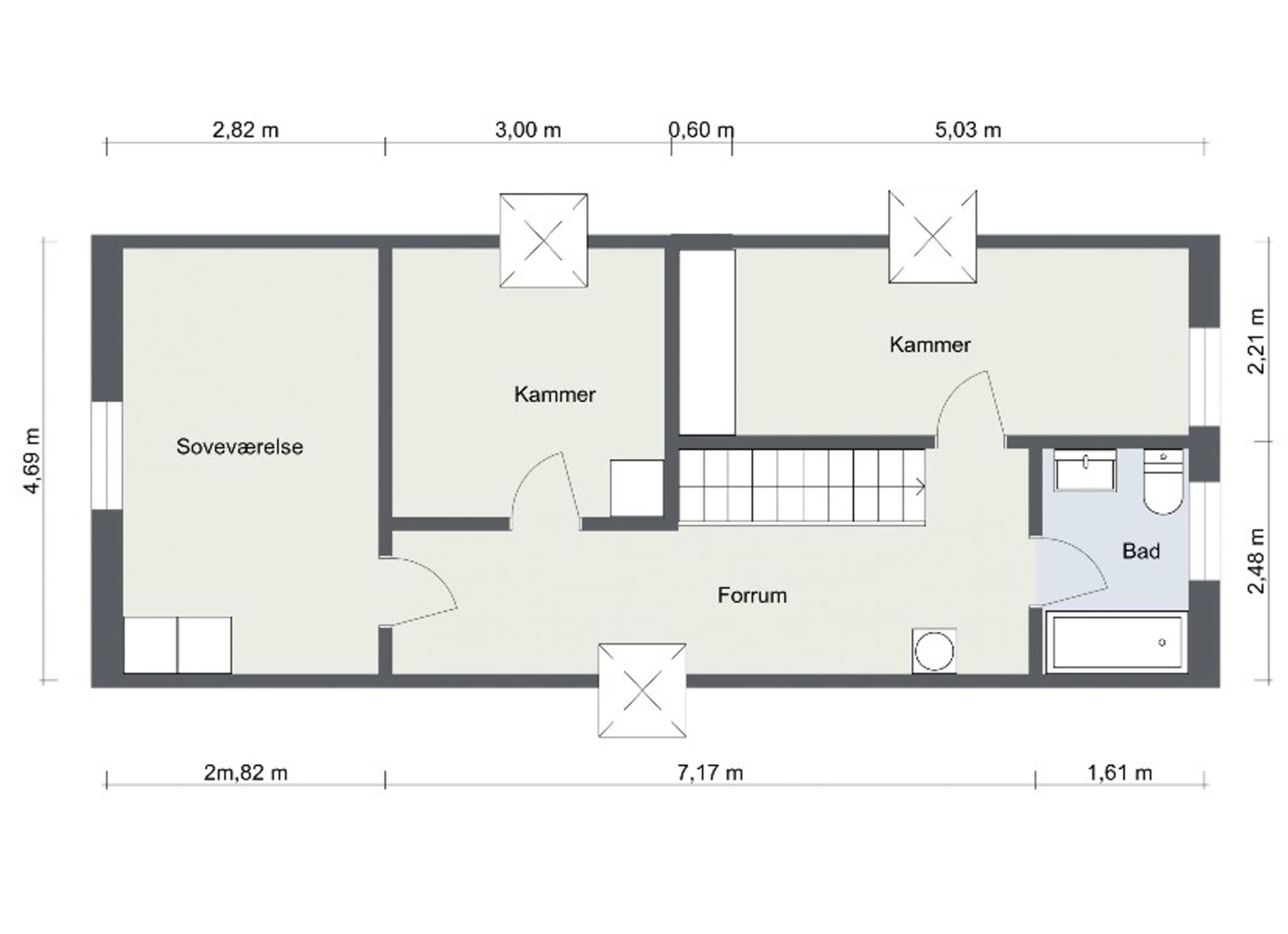 Førstesalen rummer flere gode værelser, alle med charme og udsigt. Et værelse med Velux-vindue har havkig, trægulv og indbyggede skabe. Et andet værelse har ligeledes trægulv, indbyggede skabe og havkig herfra kan toppen af Vippefyret ses. Badeværelset er indrettet med vask, toilet og karbad samt klinker på vægge og linoleum på gulv. Fra repos er der adgang til loftet. Gavlværelset mod øst er noget ganske særligt herfra er der en imponerende udsigt over fredet natur, Betty Nansens Villa, Det Hvide Fyr, toppen af Det Grå Fyr samt havkig rundt om Betty Nansens Villa.